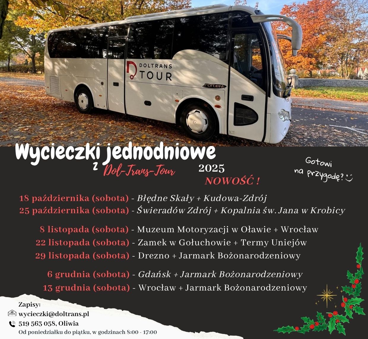 Firma Doltrans od ponad 20 lat zajmuje się transportem osób, realizując przewozy krajowe, wyjazdy międzynarodowe, pracownicze i szkolne. A od kilku lat organizuje także wycieczki jednodniowe. Tym razem celem są historyczne miasta, wyjątkowe miejsca przyrodnicze i atrakcje, które idealnie wpisują się w chłodniejszy sezon. Uczestnicy odwiedzą skalne labirynty, górskie uzdrowiska, zamki z bogatą historią, a także świąteczne jarmarki pełne blasku i zapachów. Każda z wypraw to połączenie relaksu, zwiedzania i dobrej organizacji a to wszystko bez stresu, bez pośpiechu, w przyjaznej atmosferze.