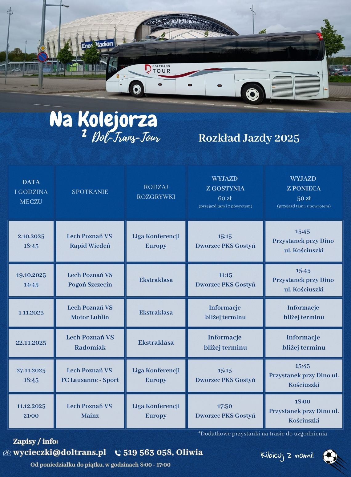 Nowością w ofercie Dol-Trans Tour na ten sezon są wyjazdy na mecze Lecha Poznań. To propozycja dla kibiców, którzy chcą bezpiecznie i wygodnie dotrzeć na stadion oraz wrócić zaraz po spotkaniu. Firma organizuje przejazdy zarówno na mecze Ekstraklasy, jak i na spotkania w Lidze Konferencji Europy. Terminy wyjazdów są dobierane do kalendarza rozgrywek, a liczba miejsc jest ograniczona dlatego warto zarezerwować wcześniej.