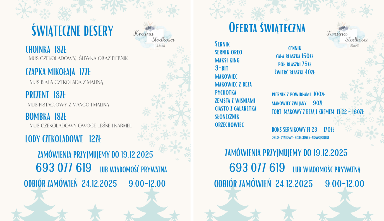 Zamówienia świąteczne przyjmowane są do 19 grudnia 2025 roku, a odbiór wypieków zaplanowano na 24 grudnia 2025 roku w godzinach od 9.00 do 12.00 w pracowni Kraina Słodkości Darii w Drzęczewie Pierwszym. Zamówienia przyjmowane są pod numerem telefonu: 693 077 619 Więcej informacji znajdziesz TUTAJ