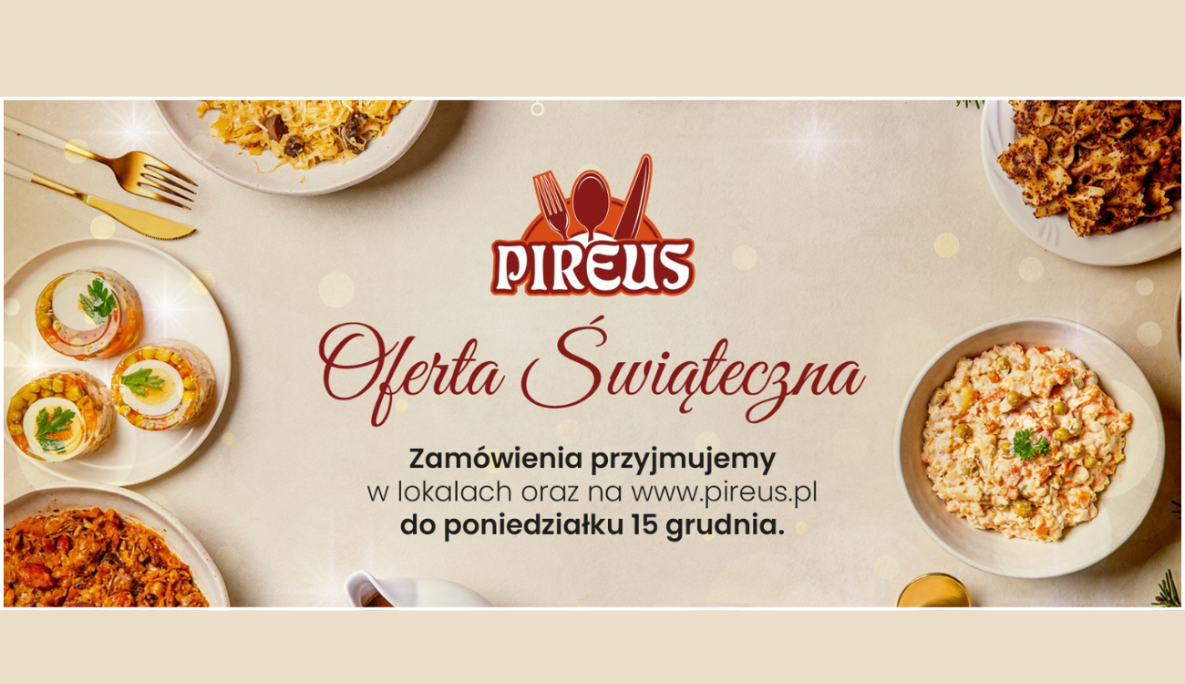 Od ponad dwudziestu lat Restauracje Pireus towarzyszą mieszkańcom regionu w najważniejszym wieczorach roku. W tym roku także przejmuje na siebie ciężar wigilijnych przygotowań, proponując menu oparte na klasycznych recepturach, naturalnych składnikach i smaku, który bez wahania można postawić na świątecznym stole. Z zamówieniami trzeba się jednak śpieszyć bo termin ich składania mija 15 grudnia.