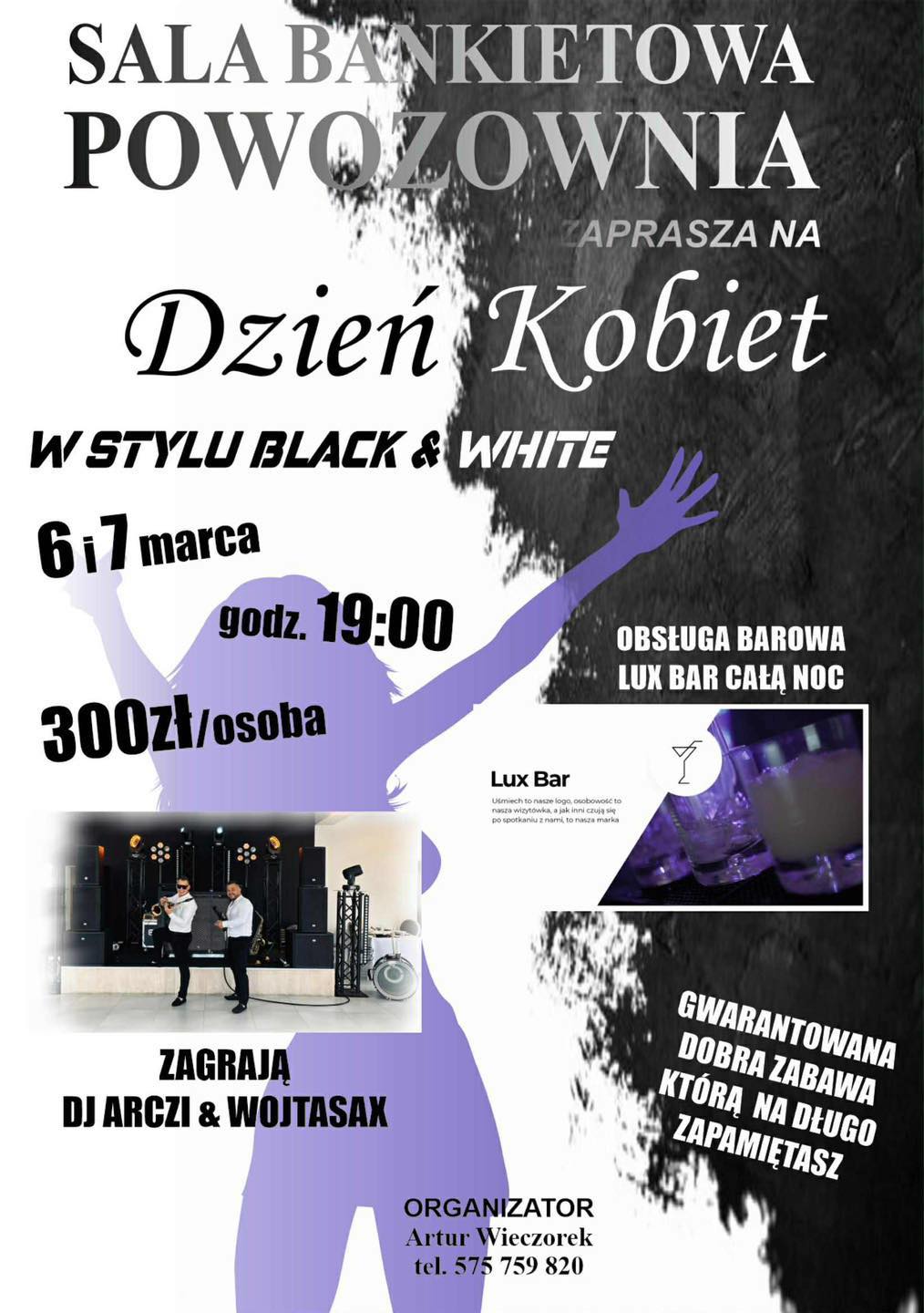 Podczas piątkowej i sobotniej imprezy z okazji Dnia Kobiet w Powozowni - 6 i 7 marca, na wszystkie panie czekać będzie DJ Artur Wieczorek oraz Woj Sax, którzy do białego rana zamierzają grać radiowe hity, muzykę elektroniczną i disco polo. Na miejscu będą też barmani, serwujący bezpłatnie drinki, a całość została przewidziana w formule open bar. W cenie jest także pełne wyżywienie w postaci kolacji, zimnego bufetu, ciast oraz drugiej kolacji. A wszystko w klimacie Black & White, który ma nadać imprezie wyjątkowej elegancji i spójnego charakteru.