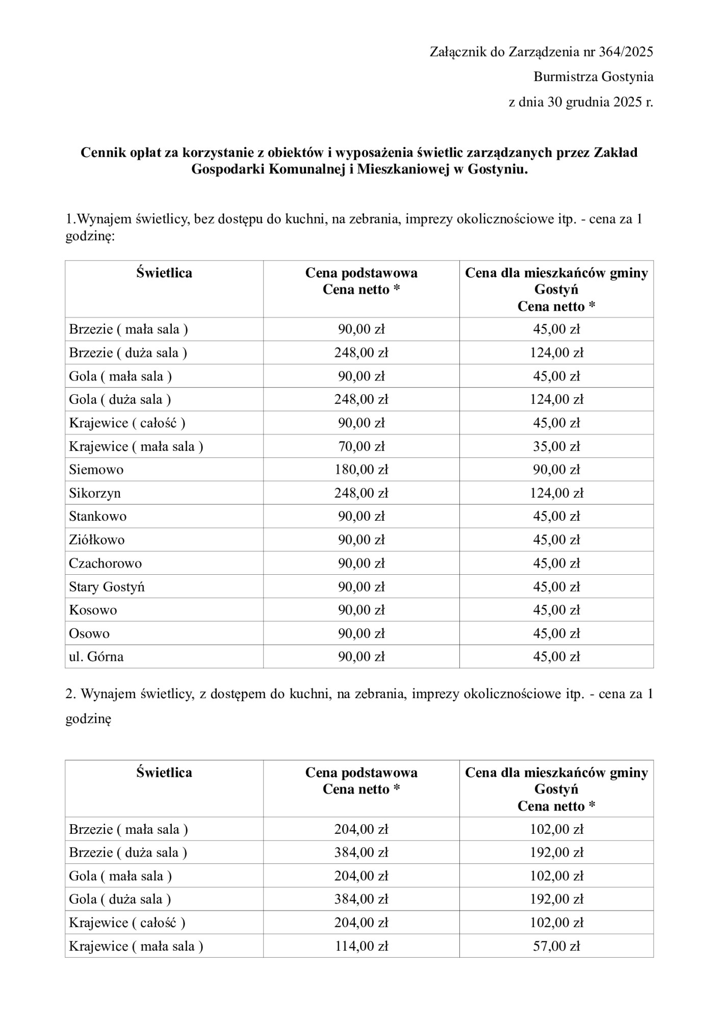 Poniżej dokładny cennik. Foto: Screen zarządzenie UM Gostyń
