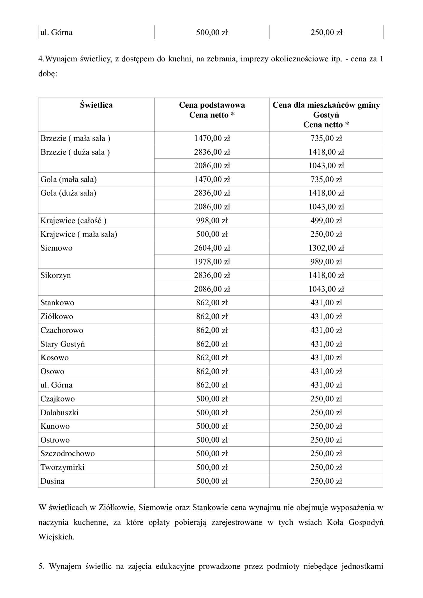 Z zestawienia stawek wynika, że najdrożej zapłacą ci, którzy zdecydują się na wynajem dużych sali z dostępem do kuchni. W tej kategorii najwyższe ceny dotyczą świetlic w Brzeziu, Goli oraz Sikorzynie, gdzie koszt dobowego wynajmu w wariancie podstawowym sięga kilku tysięcy złotych netto za dobę. Nawet po uwzględnieniu 50-procentowej zniżki dla mieszkańców gminy są to kwoty, które trudno uznać za symboliczne.