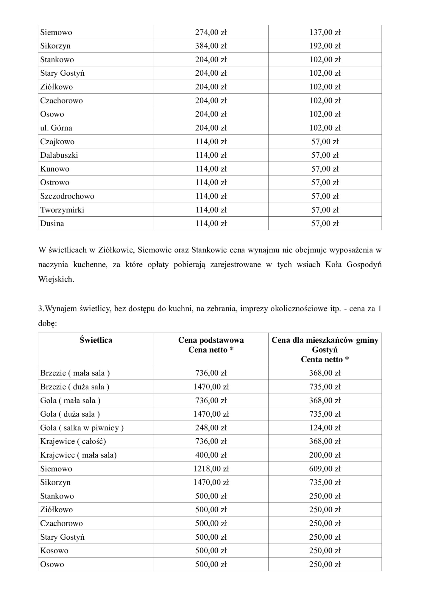 Wysoko w zestawieniu plasuje się także świetlica w Siemowie, która zarówno przy rozliczeniu godzinowym, jak i dobowym należy do droższych obiektów w gminnym zasobie. Tańsze pozostają mniejsze świetlice wiejskie, gdzie ceny wynajmu są wyraźnie niższe, zwłaszcza przy braku dostępu do zaplecza kuchennego.