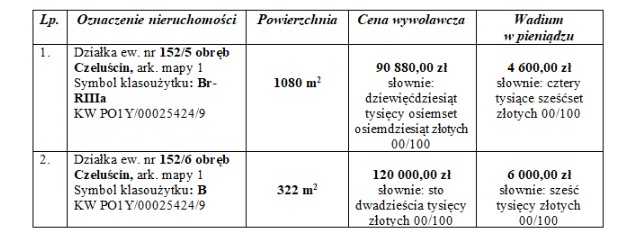 ogłasza II ustny przetarg nieograniczony na sprzedaż na własność niżej wymienionych nieruchomości położonych w miejscowości Czeluścin.