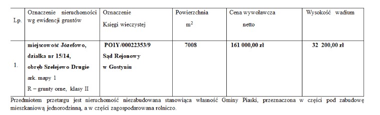 1. miejscowość Józefowo, działka nr 15/14, obręb Szelejewo Drugie ark. mapy 1 R – grunty orne, klasy II PO1Y/00022353/9 Sąd Rejonowy w Gostyniu 7008 161 000,00 zł 32 200,00 zł