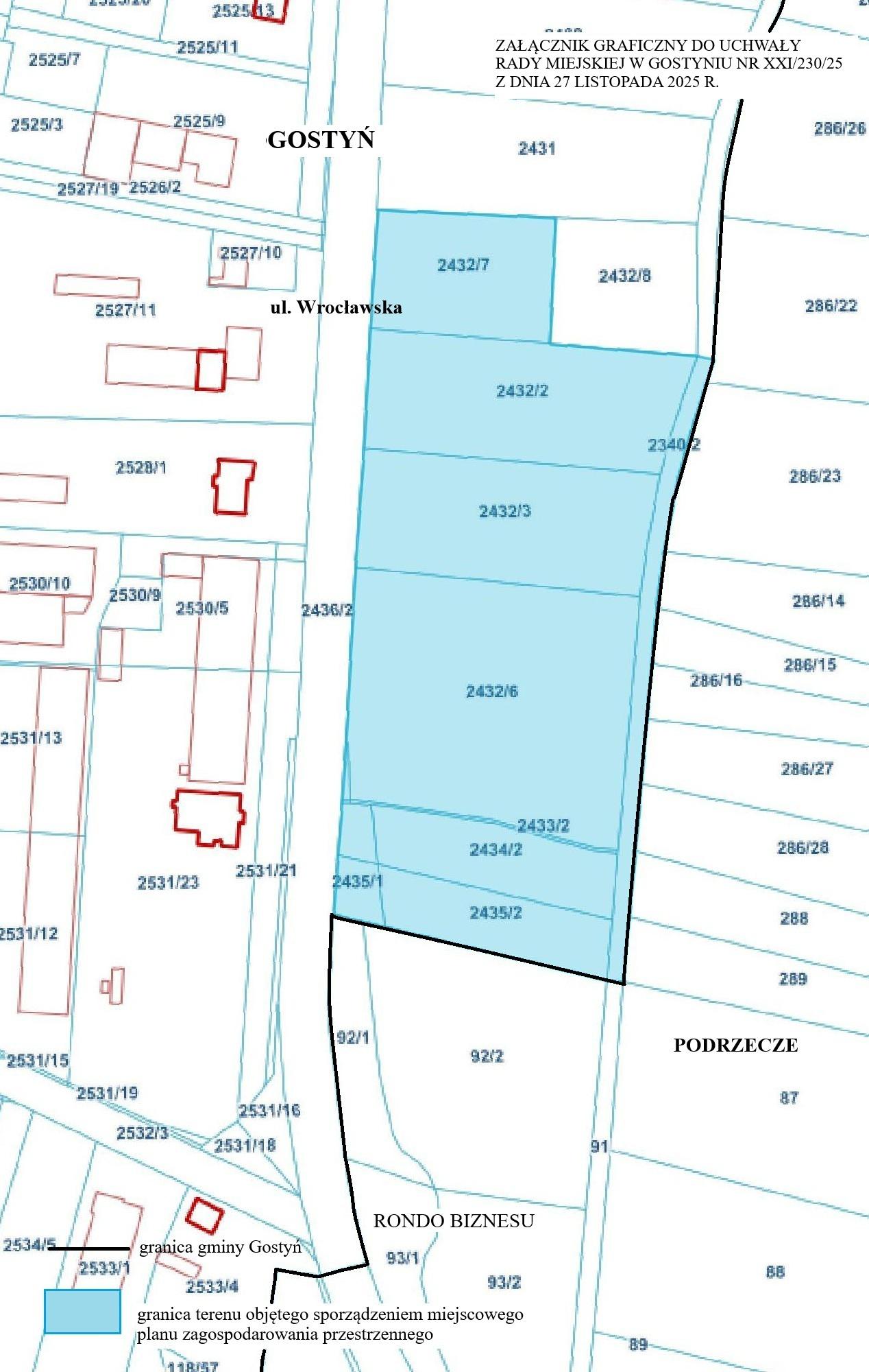 Na podstawie art. 17 pkt 1 Ustawy z dnia 27 marca 2003 r. o planowaniu i zagospodarowaniu przestrzennym (t.j. Dz.U. z 2024 r. poz. 1130 ze zm.) oraz na podstawie art. 39 ust. 1 pkt 1, 3 i 5 w związku z art. 54 ust.2 Ustawy z dnia 3 października 2008 r. o udostępnianiu informacji o środowisku i jego ochronie, udziale społeczeństwa w ochronie środowiska oraz ocenach oddziaływania na środowisko (t.j. Dz.U. z 2024 r. poz. 1112 ze zm.) zawiadamiam o podjęciu przez Radę Miejską w Gostyniu Uchwały Nr XXI/230/25 z dnia 27 listopada 2025 r. w sprawie przystąpienia do sporządzenia Miejscowego planu zagospodarowania przestrzennego obszaru przy ul. Wrocławskiej w Gostyniu w rejonie Ronda Biznesu.