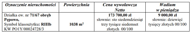 Ustny przetarg nieograniczony odbędzie się w siedzibie Urzędu Gminy Pępowo, ul. St. Nadstawek 6 (sala posiedzeń) w dniu 08.04.2026 r. o godzinie 10.00