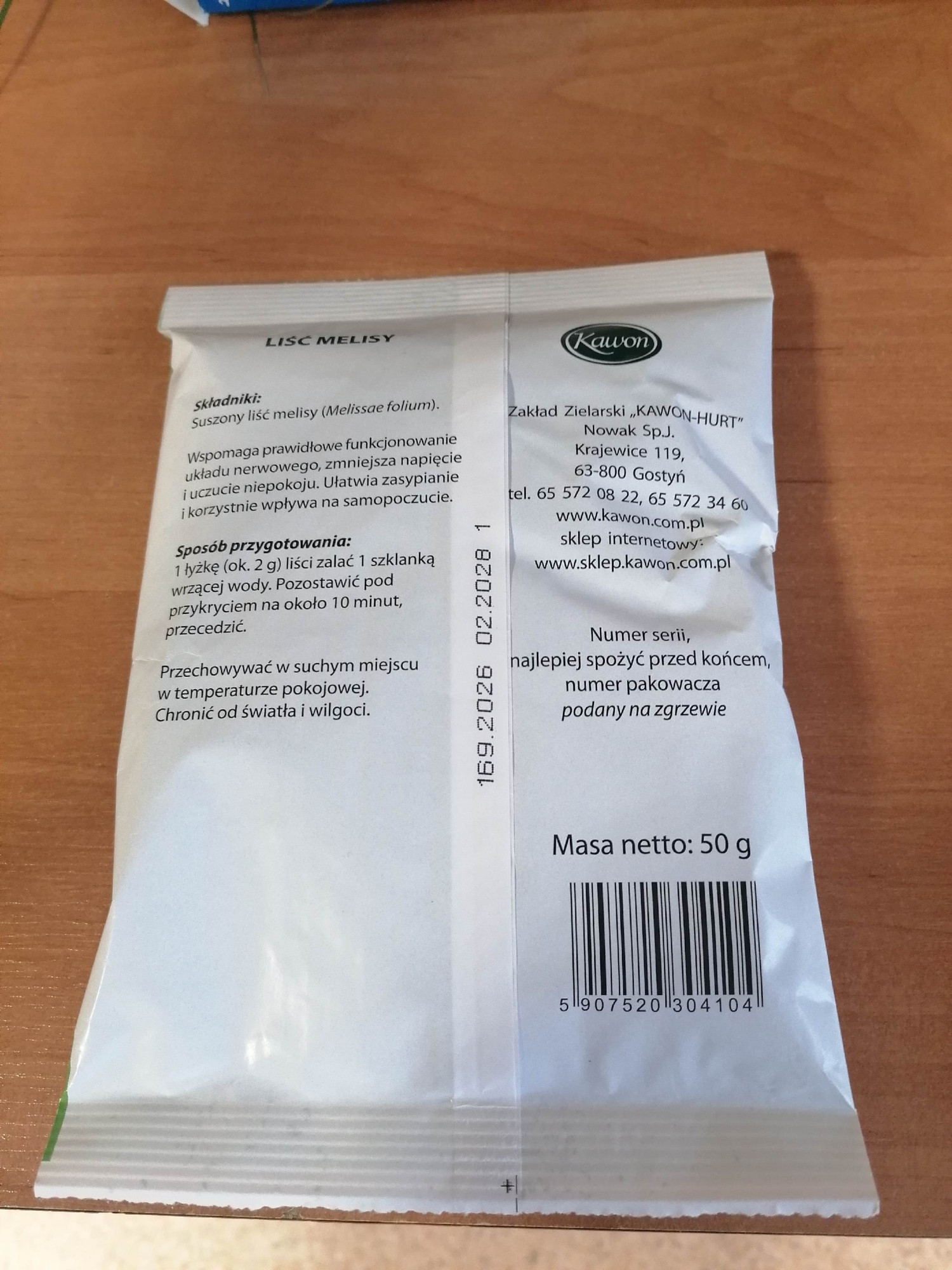 Wycofaniem objęto produkt: Liść melisy, Kawon, 50 g. Producentem jest Zakład Zielarski „KAWON-HURT” Nowak Sp. J., Krajewice 119, 63-800 Gostyń. Z rynku wycofywane są trzy partie produktu: 169.2026 - data minimalnej trwałości: 28.02.2028, 117.2026 - data minimalnej trwałości: 28.02.2028, 257.2026 - data minimalnej trwałości: 31.03.2028.
