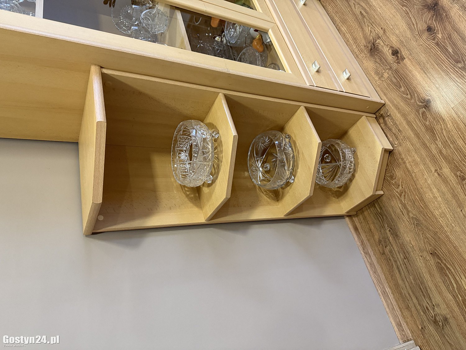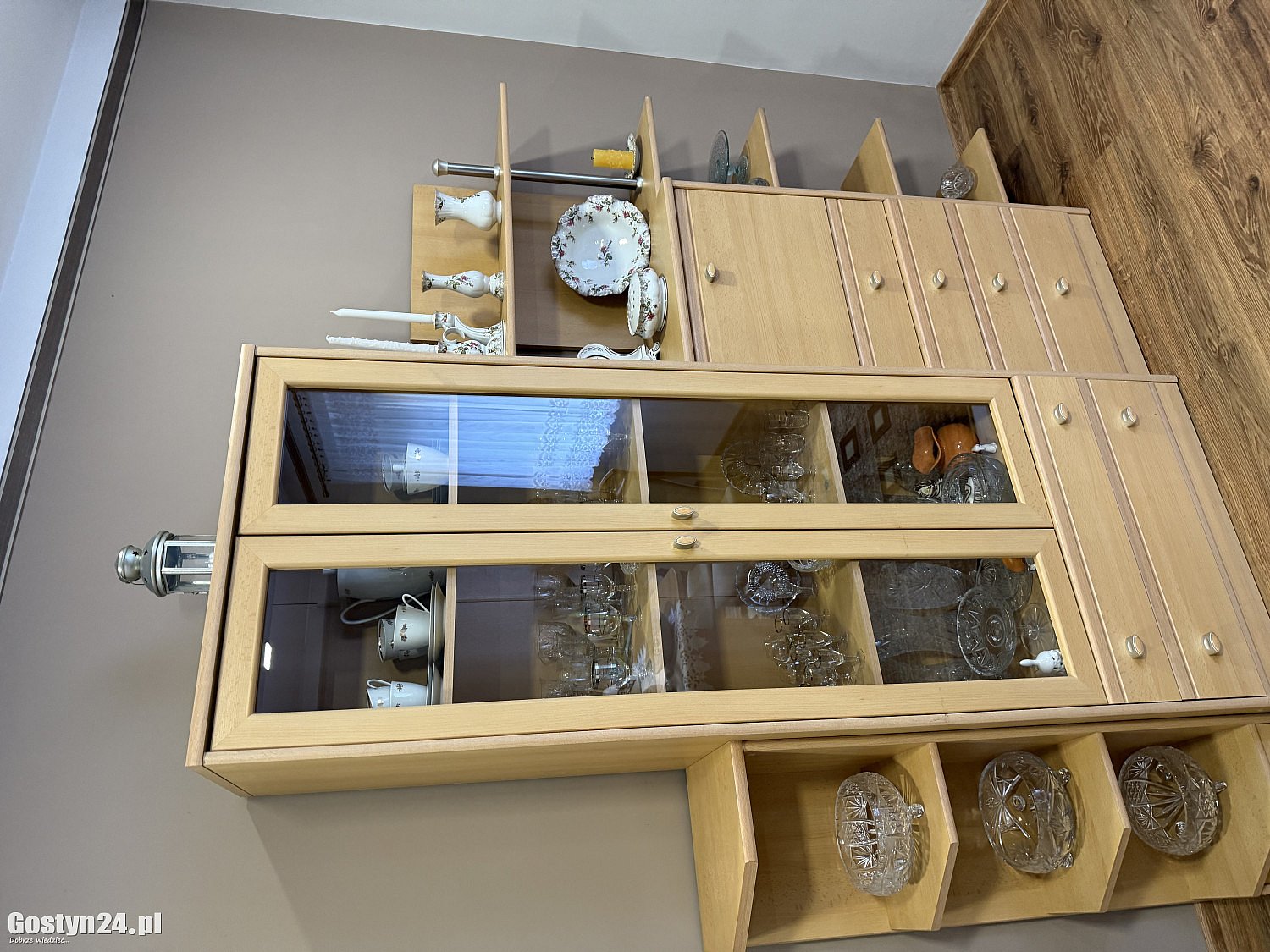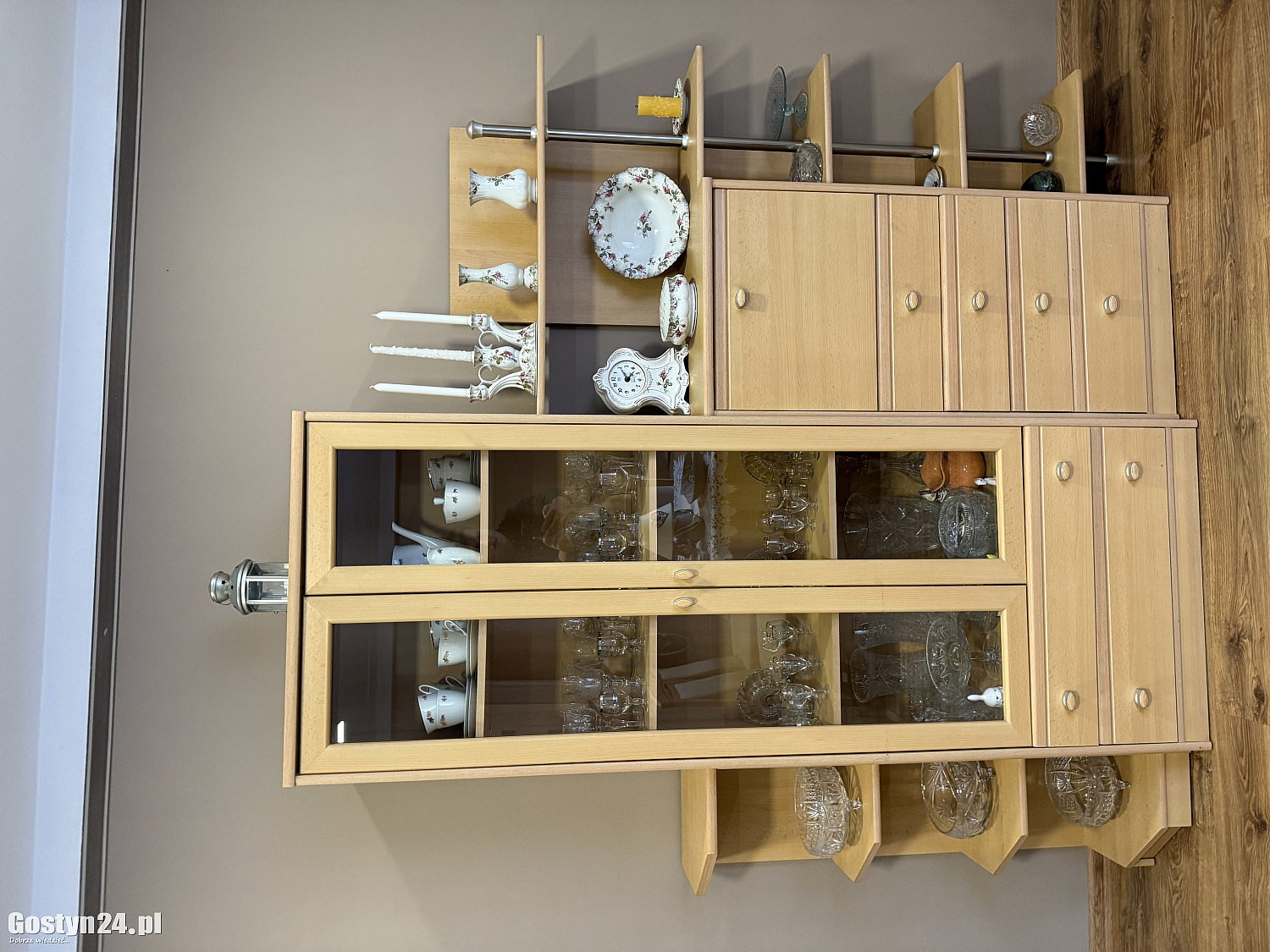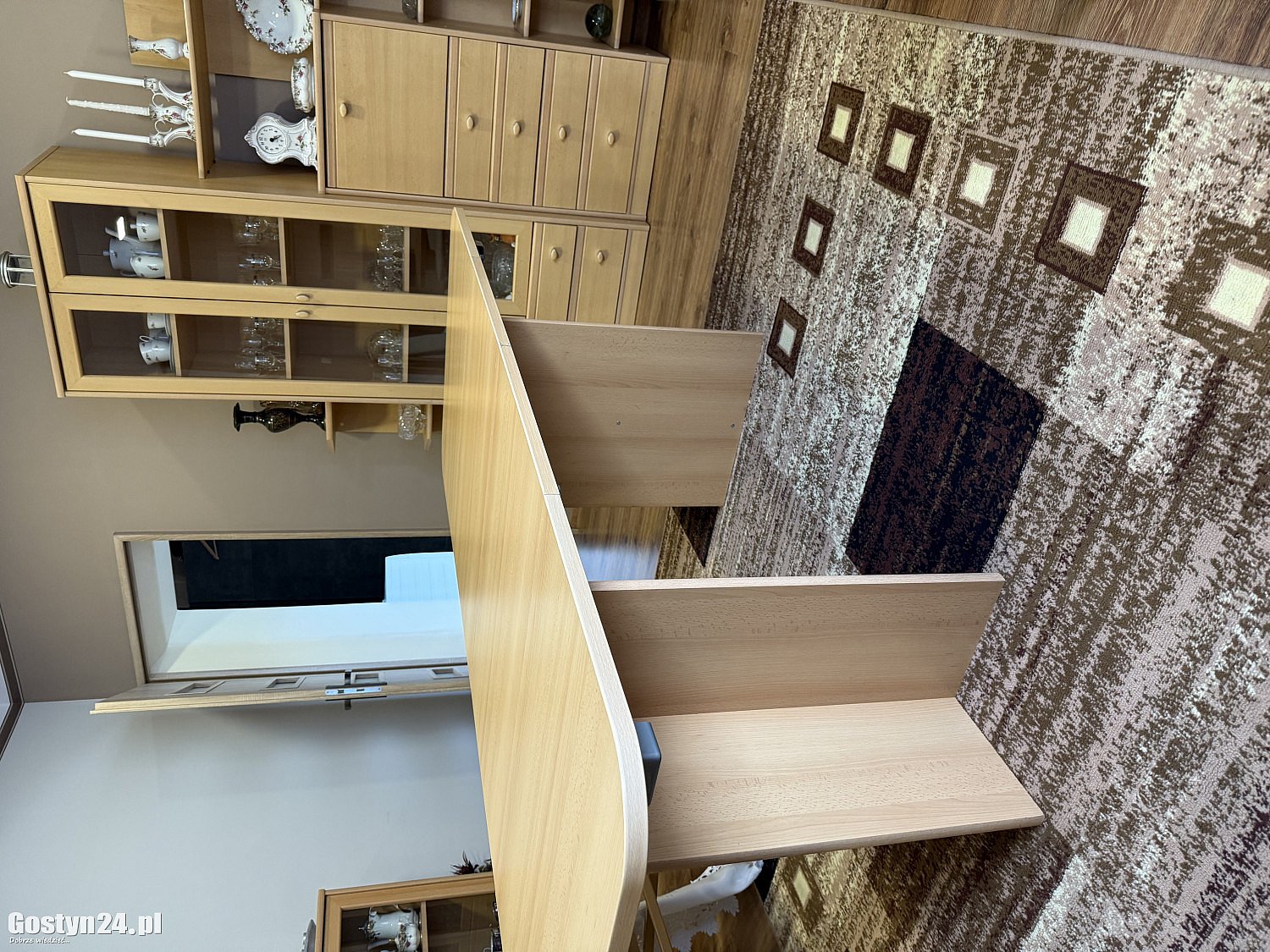 mam do zaoferowania komplet mebli do jadalni/salonu. Stan mebli jest bardzo dobry. Komplet składa się z: kredensu, witryny z dwoma szufladami, regału, barku z 4 szufladami i półkami oraz półki ściennej oraz rozkładanego stołu.