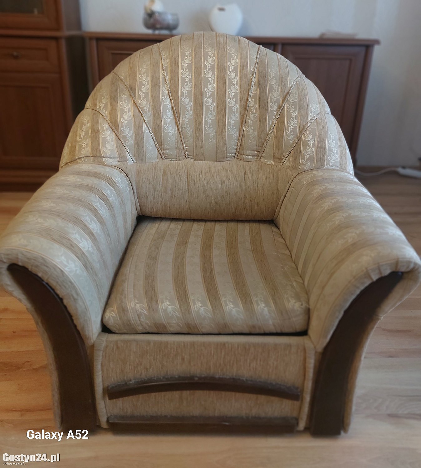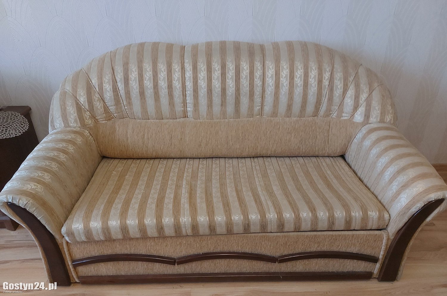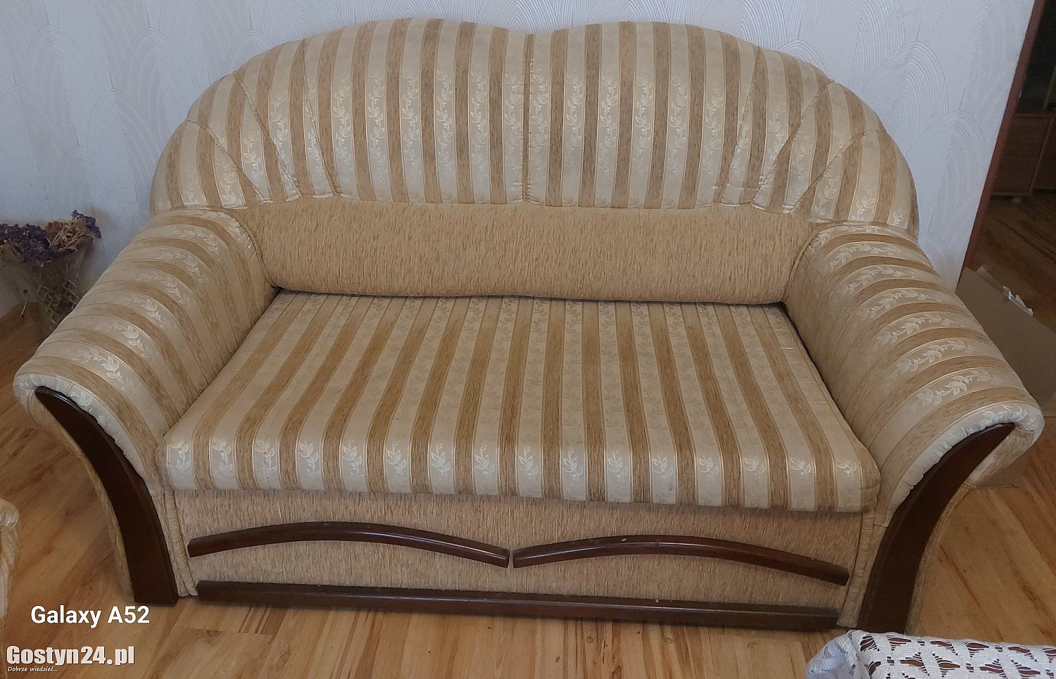 Dwie wygodne, rozkładane sofy 2 osobowa i 3 osobowa i wygodny fotel w stylu retro. Wypoczynek posiada charakterystyczne, falowane oparcia i drewniane elementy. Może służyć jako dodatkowe miejsce do spania. Mimo że jest używana, nadal prezentuje się dobrze i może być atrakcyjnym uzupełnieniem wnętrza.