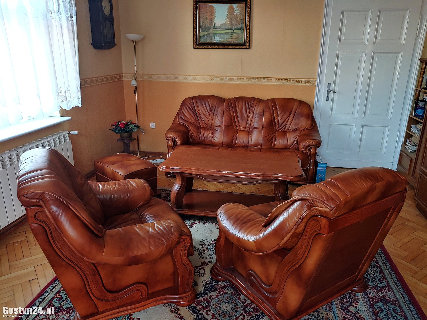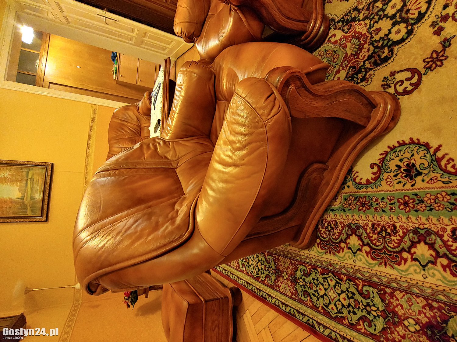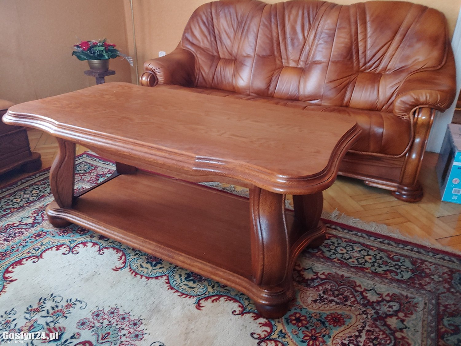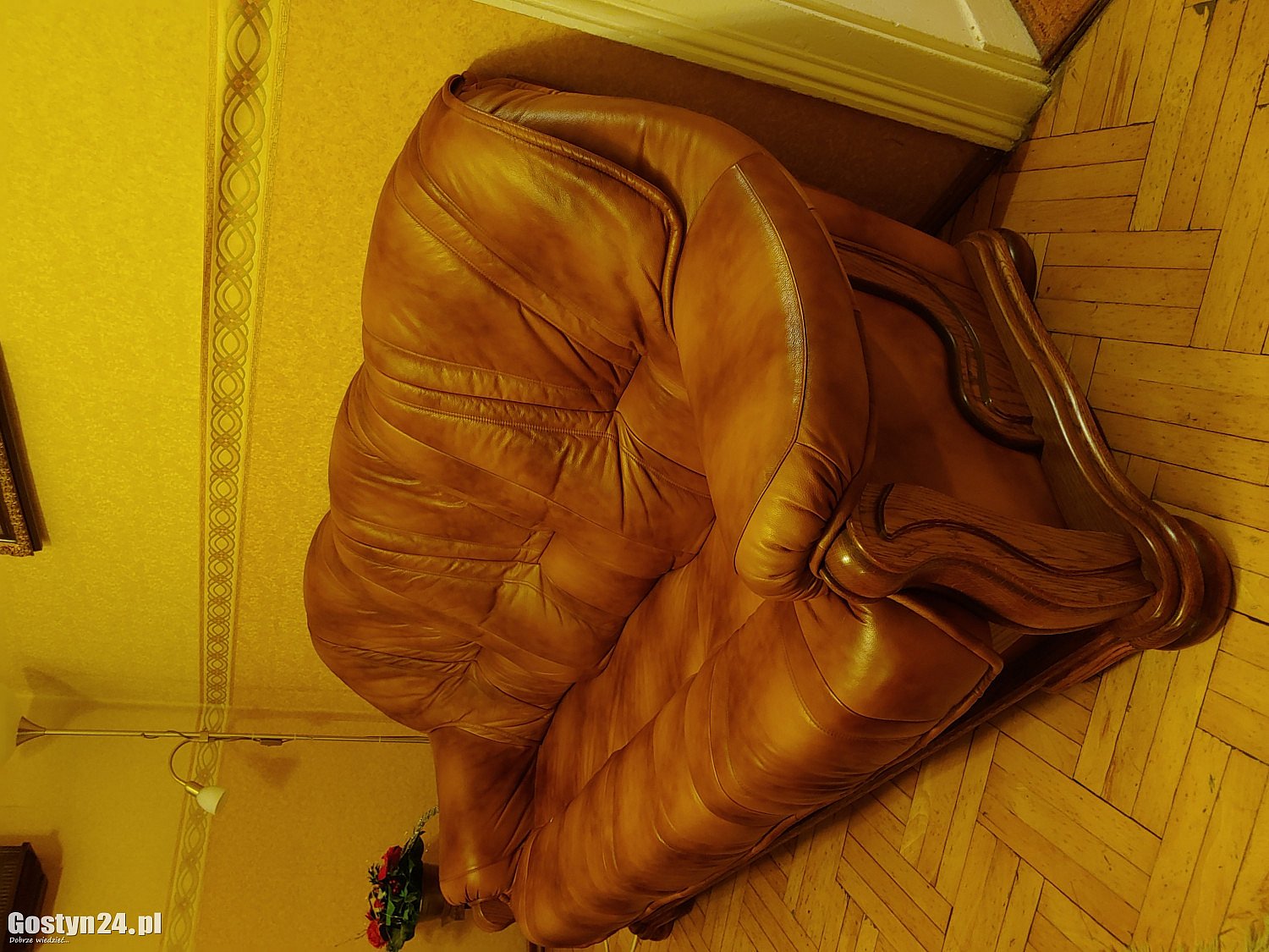 Sprzedam wypoczynek skórzany, który składa się z kanapy trzyosobowej, dwóch foteli oraz ławy. Kanapa oraz fotele są z elementami drewna oraz skóry w kolorze ciepłego brązu. Zestaw skórzany mało używany, stan bardzo dobry.