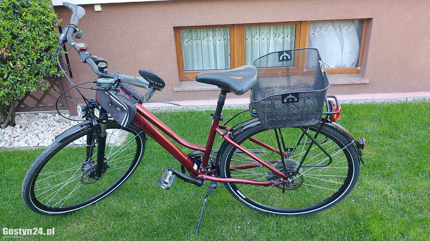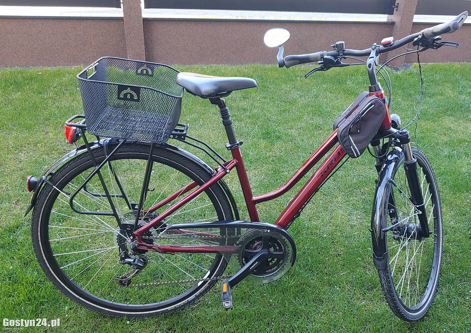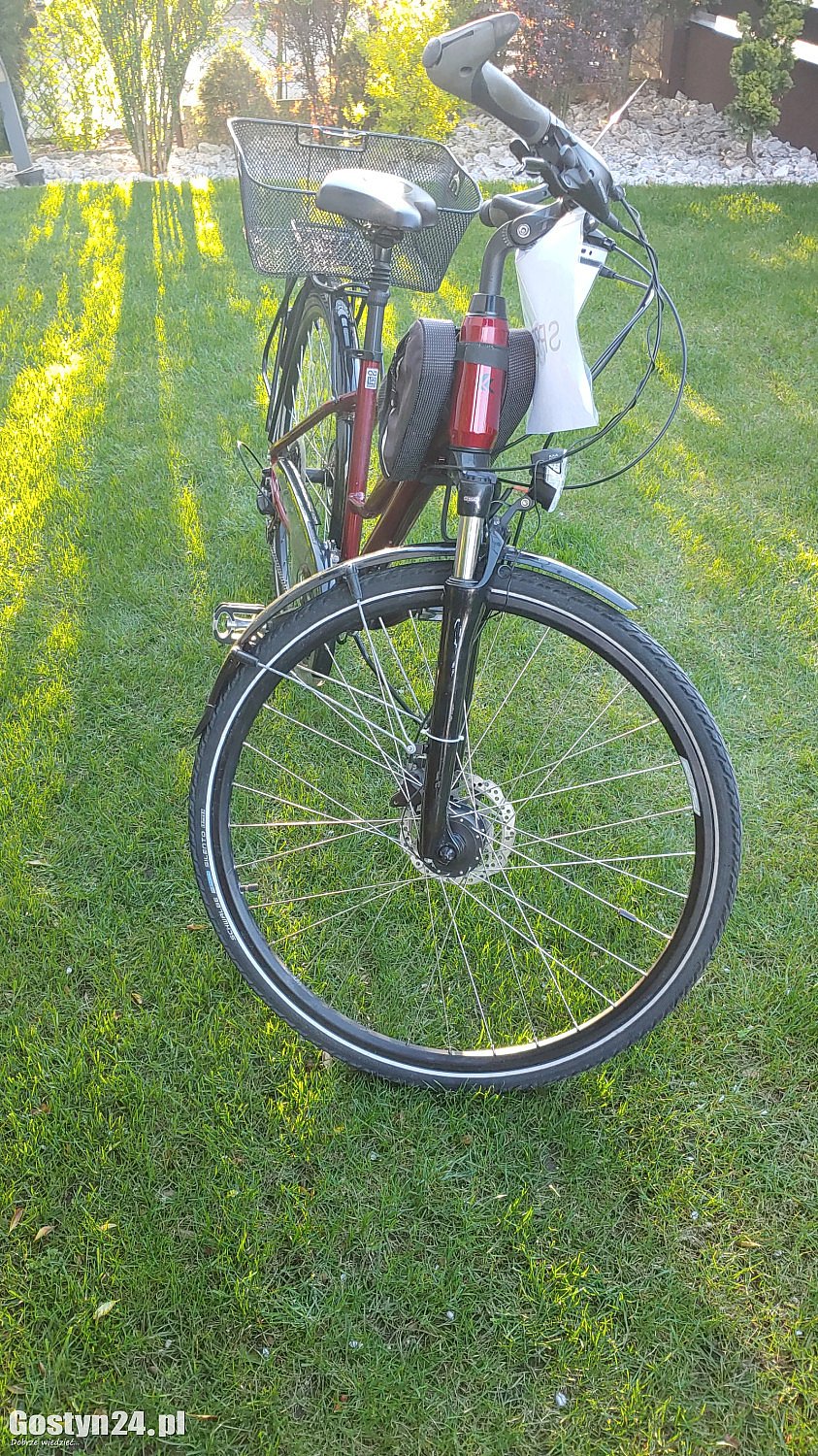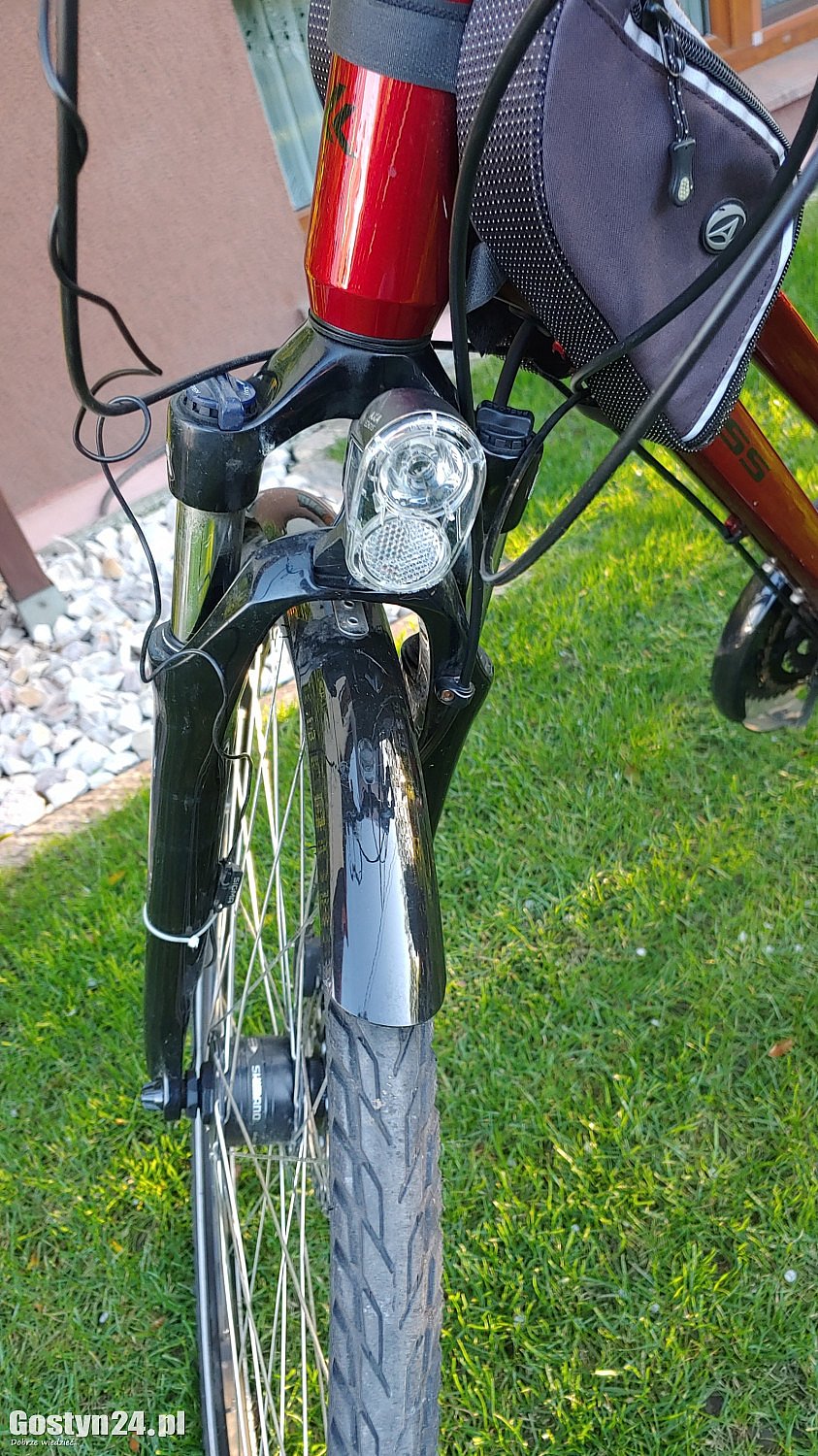 Rower KROSS 5.0 damka używany, koła 27 cali, wyposażenie: koszyk, dzwonek, oświetlenie przód-tył, prędkościomierz, biegi 3 x 8, lusterko, saszetka na ramie, posiada ślady normalnego użytkowania.